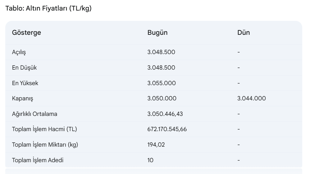 Hafta boyunca yaşanan dalgalanmaların ardından altın, bugün yüzde 0.2’lik bir artışla 3 milyon 50 bin TL seviyesine ulaştı. Altının kilogramı, KMKTP’de işlem gören en düşük seviye 3 milyon 48 bin 500 TL, en yüksek seviye ise 3 milyon 55 bin TL olarak gerçekleşti.